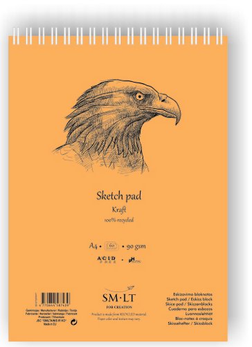 Bloc de tapa dura con espiral doble en la parte superior y papel kraft, 100% reciclado, microperforado, libre de ácido, con pH neutro y certificado FSC, en su interior. Un producto auténtico para lápiz, bolígrafo, tizas, crayones y carboncillo.